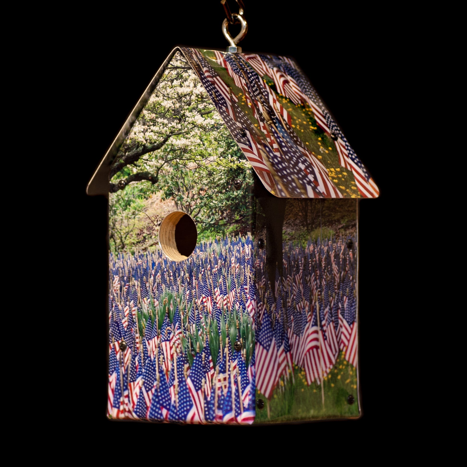 When she first caught sight of this scene out of the corner of her eye while playing fife in a parade, Sally thought it was a field of blue flowers. Unable to imagine what would be blooming like that, at that time of year, she headed back for a closer look after the parade with her camera. That's when she realized they weren't flowers, they were flags! A beautiful and touching sight on the hillside meadow in front of a church in Essex, Connecticut. The memory of that stays with her, and she's glad to be sharing it on this Memorial Flags birdhouse.