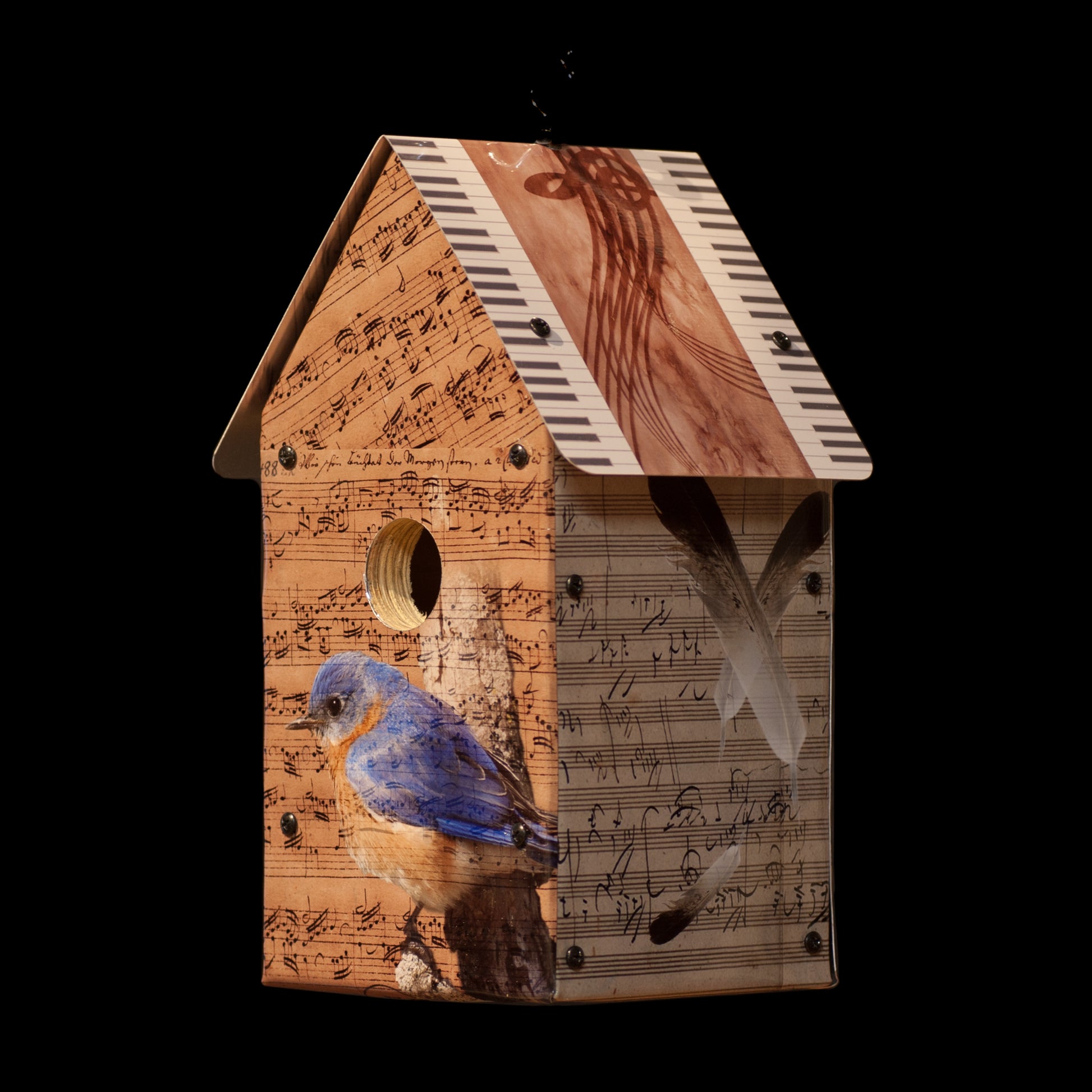 Music manuscripts by the hands of the masters themselves grace this birdhouse. From a distance, it looks like bark or wood. But upclose the details are clearly visible. Choose your spot for the musicians of your garden (the birds!) to raise a brood.